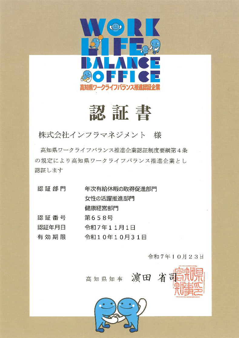 当社は「高知県ワークライフバランス推進企業」として、全6部門のうち3部門において認証をいただきました。